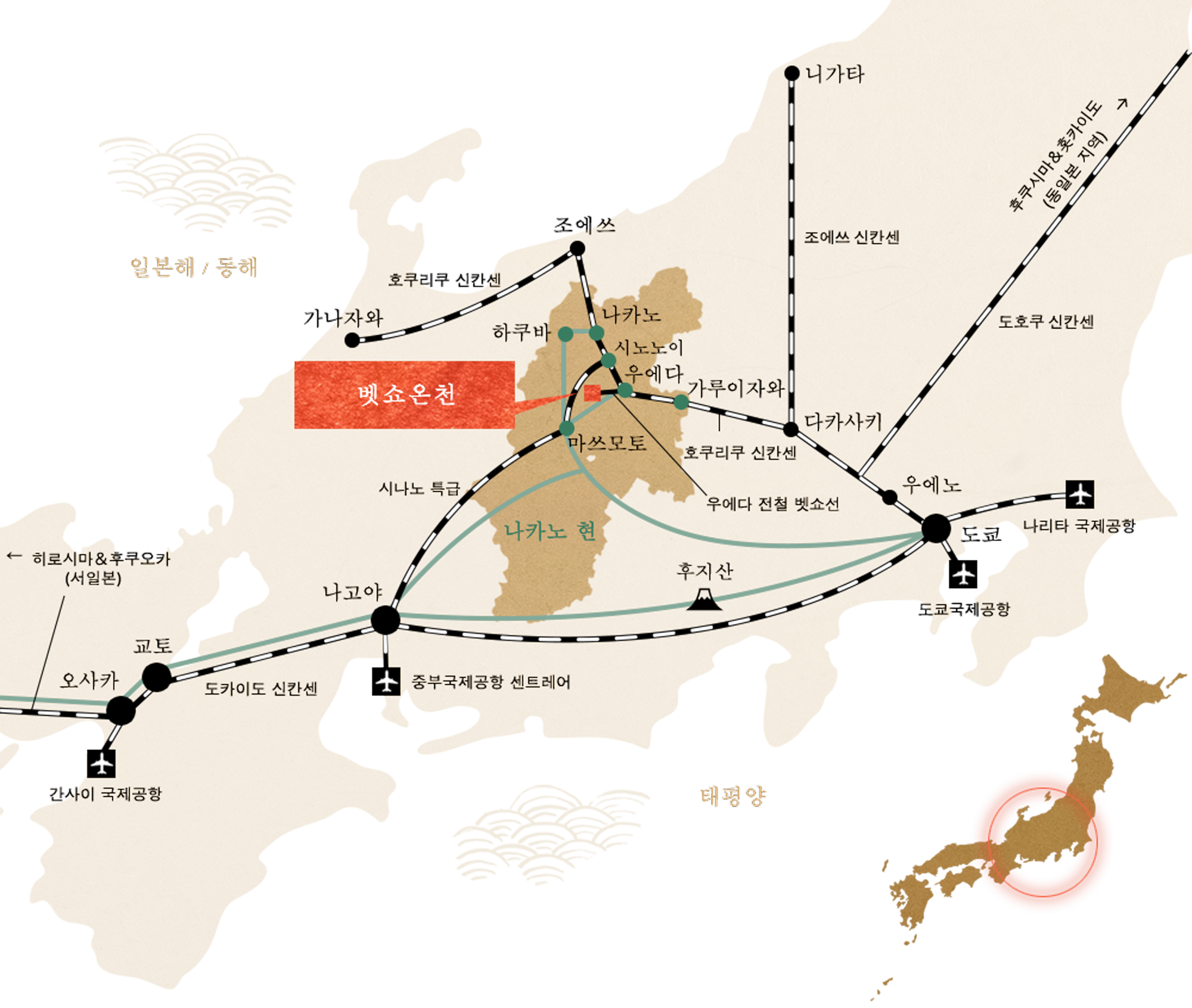 또한, 나가노현의 대표적인 관광지인 하쿠바, 가루이자와, 마쓰모토까지 차로 약 1시간만에 이동할 수 있습니다.