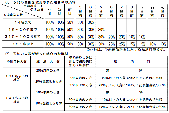 | 第5条 | 当館は、宿泊予約の申込者が、宿泊予約の全部又は一部を解除したときは、次に掲げるところにより、違約金を申し受けます。 |